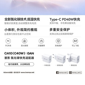 REMAX睿量慧影单口输出氮化镓轻巧便携过流过压保护手机充电器