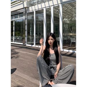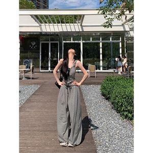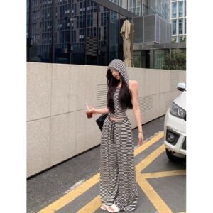 辣妹时尚条纹露背无袖连帽背心抽绳宽松休闲长裤套装女夏季两件套