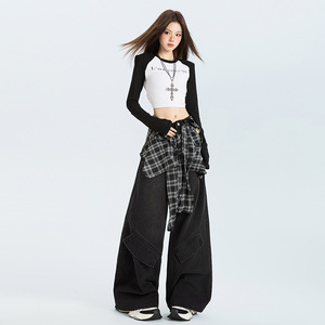美式高街复古阔腿可拆卸屁帘牛仔裤早秋宽松直筒垂感爵士舞可拆卸