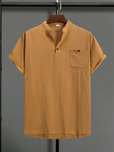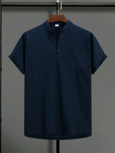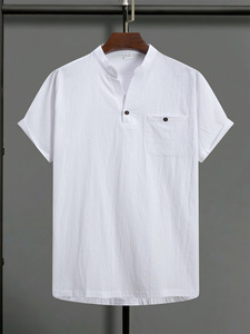 欧美跨境亚马逊男士短袖衬衫夏季休闲透气纽扣棉麻纯色立领亨利衫