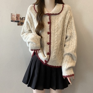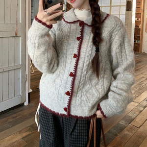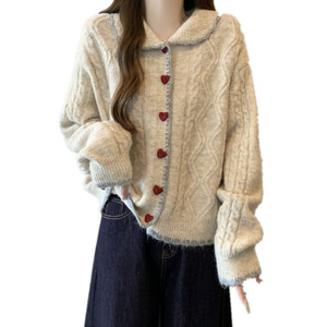 大码翻领秋冬季复古针织衫外套爱心扣慵懒风娃娃领麻花宽松毛衣女