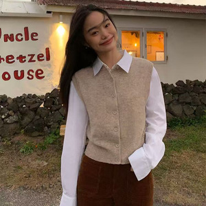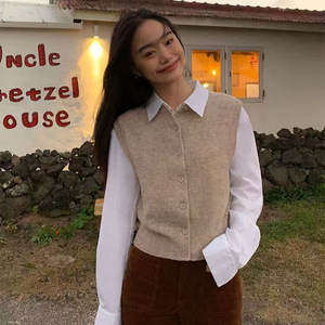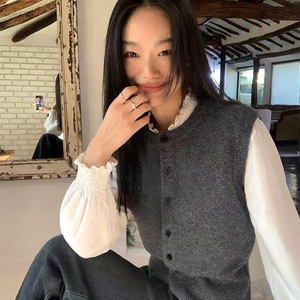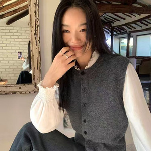 pusumede 灰色圆领毛衣马甲女开衫秋冬百搭叠穿坎肩针织背心上衣