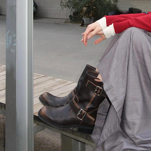 羊皮版~复古擦色真皮厚底中筒靴女宽筒粗跟马丁靴骑士短靴西部靴