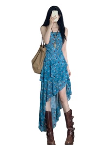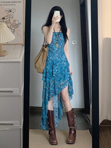 度假风复古碎花吊带连衣裙女夏季设计感不规则长裙收腰显瘦A字裙