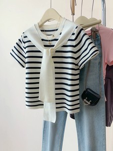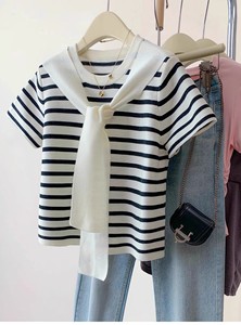 条纹假两件拼接正肩短袖t恤女夏夏季2025新款设计感披肩宽松上衣
