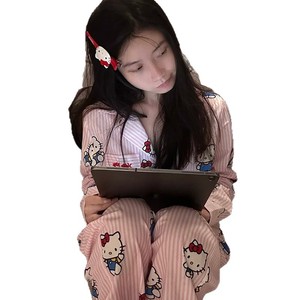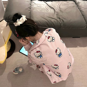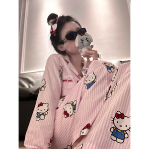 2025新款条纹kitty猫冰丝睡衣女春秋季长袖休闲风家居服夏天短袖