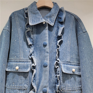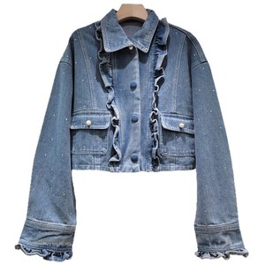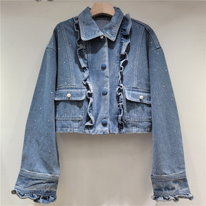 2025秋季新款小众设计感荷叶边烫钻翻领长袖牛仔修身短外套女