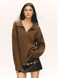 跨境大版绞花翻领毛衣女 2025秋冬新款慵懒风Polo领针织上衣