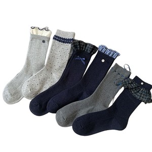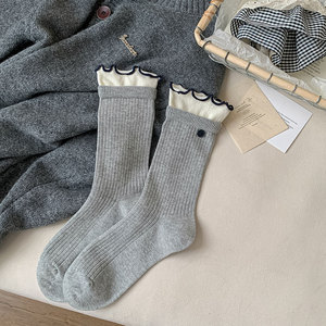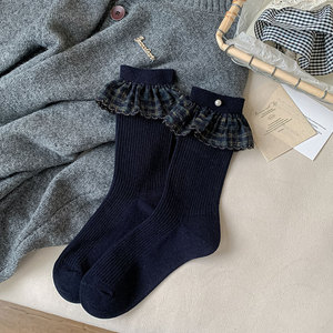 藏蓝色复古花边袜子女中筒袜秋季miu蝴蝶结堆堆袜长筒袜配小皮鞋
