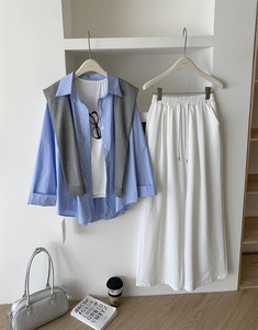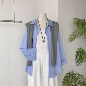 慵懒感蓝色防晒衬衫+披肩+背心+松紧腰阔腿裤四件套女秋韩系套装