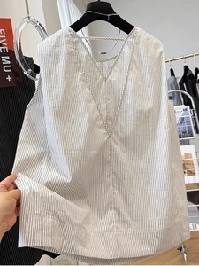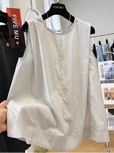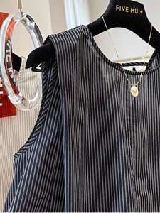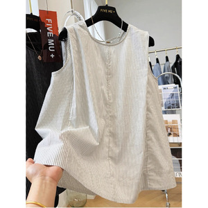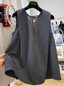 日系复古竖条纹背心衬衫女夏季时尚百搭宽松显瘦圆领无袖小衫上衣
