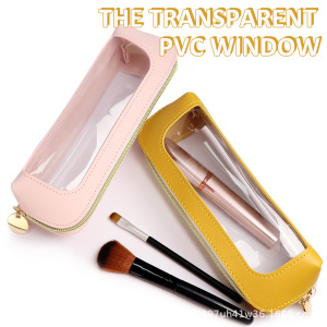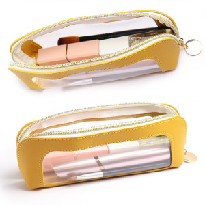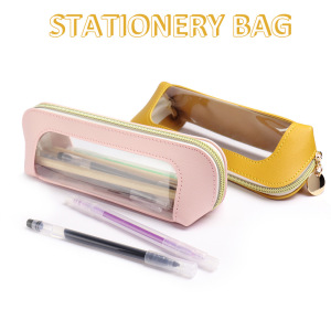 现货大容量学生笔袋 PU皮革拼接拉链笔盒 防水透明出窗口方形笔袋