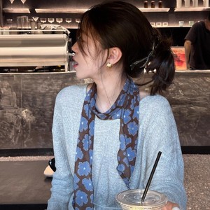 韩系蓝色花朵长条丝巾女夏季高级感系脖领巾薄款气质时髦发带配饰