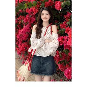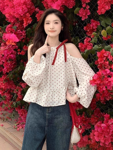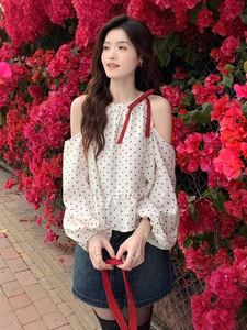 甜美风蝴蝶结波点露肩长袖衬衫女春季少女感显瘦松弛感宽松上衣潮