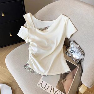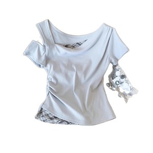 2025夏季新款纯欲辣妹露肩拼接格子短袖T恤女假两件褶皱修身上衣