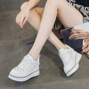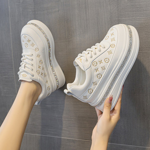 跨境春秋季厚底松糕小白鞋小个子水钻印花百搭真皮单鞋女休闲板鞋