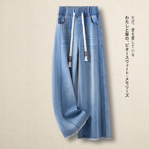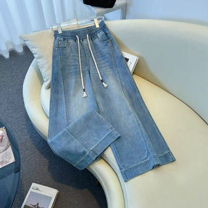 松紧腰阔腿牛仔裤女夏季薄款2025新款九分裤高腰大码宽松直筒裤子