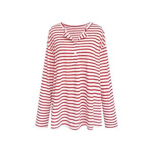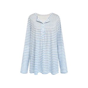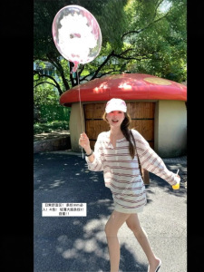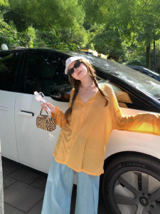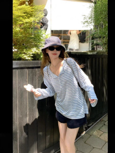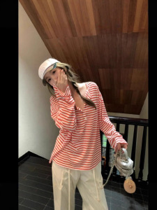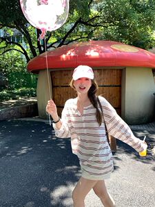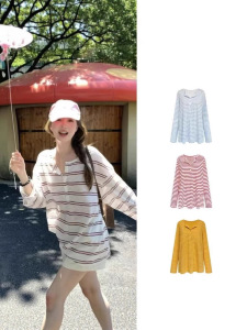 工厂现货 垂感轻薄撞色开领罩衫上衣女夏季薄款条纹宽松长袖T恤新