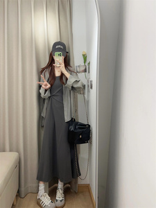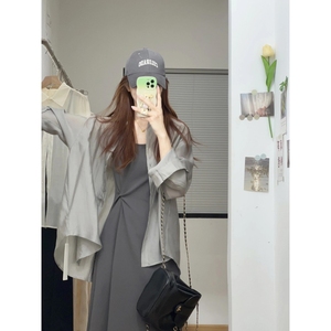 初夏搭配一整套大码宽松显瘦休闲天丝防晒衬衫吊带连衣裙两件套女