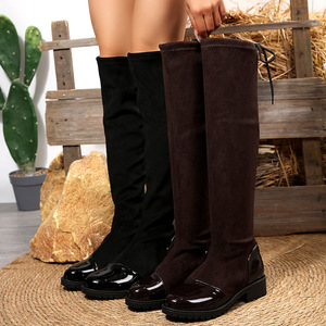 外贸绒面过膝弹力瘦瘦靴女2025秋季新款后系带大码复古拼接时装靴