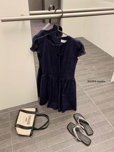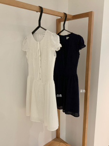 WGWE 韩系温柔风设计感镂空刺绣收腰泡泡袖a字V领短袖连衣裙W6675