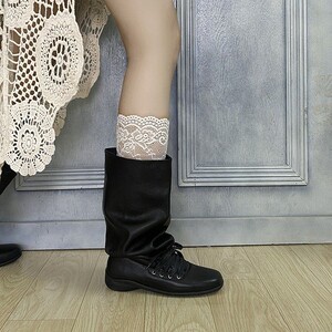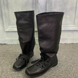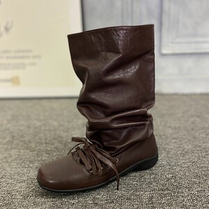 皮质复古西部堆堆靴女欧洲站2025芭蕾舞绑带褶皱中筒靴套筒瘦瘦靴