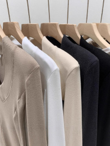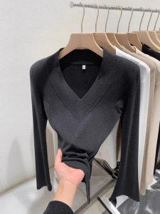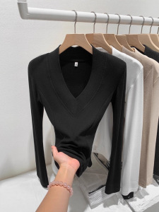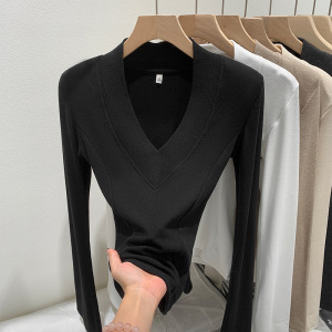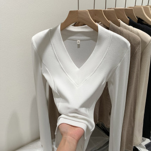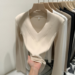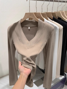 高级感低V领修身内搭磨毛打底衫女春秋2025新款紧身内搭长袖上衣