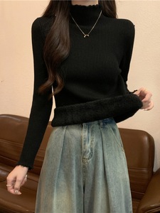 跨境木耳边半高领长袖打底针织衫上衣秋冬季加厚一体绒保暖毛衣女