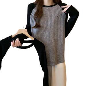 大码重磅加厚坑条撞色打底衫女秋冬季新款宽松显瘦保暖长袖上衣女