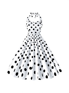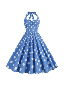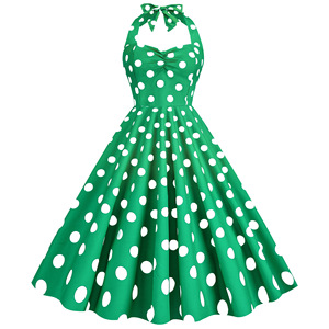 欧美复古波点挂脖连衣裙高腰舞台演出团体演绎大摆裙跨境现货