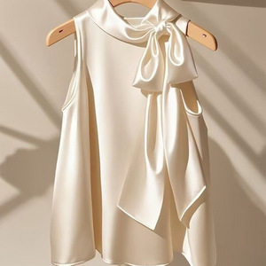缎面法式夏季小衫香槟洋气薄白宽松蝴蝶结衬衫挂脖上衣女减龄新款