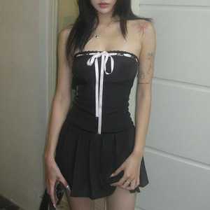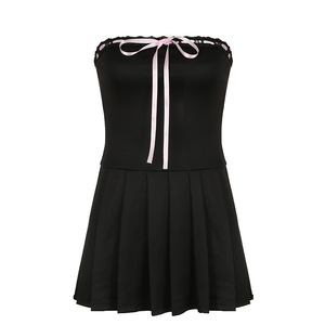 法式设计感撞色系带蝴蝶结抹胸裙一字领收腰显瘦百褶短裙连衣裙女