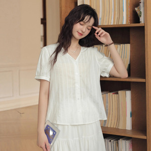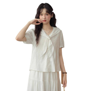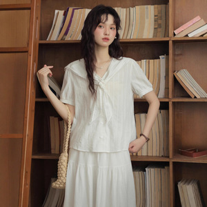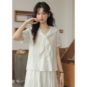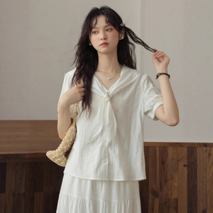 学院风海军领飘带白色V领衬衫女夏温柔风优雅气质百搭条纹上衣
