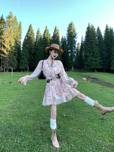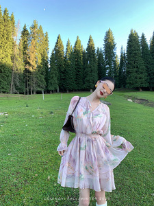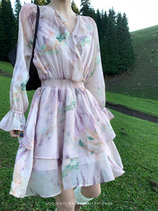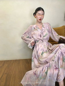鹭青一【映容】法式晕染印花连衣裙女夏度假风气质收腰中长裙