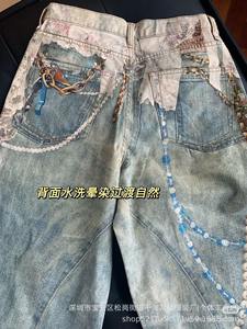 25SS南油品质高端女装AC蕾丝珍珠链条3D印花高腰阔腿直筒牛仔裤女