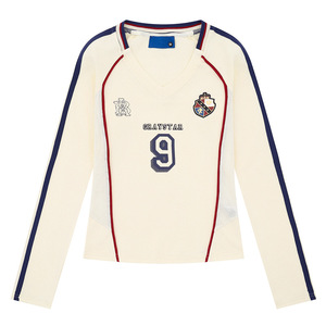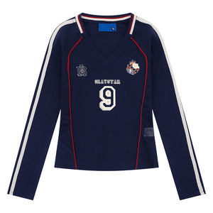衣品男装美式复古球衣撞色条纹v领长袖t恤女秋季辣妹修身显瘦短款