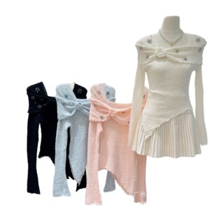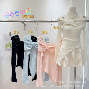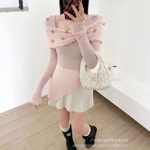 法式气质木耳边立体花朵一字肩针织衫上衣女修身小众内搭秋冬毛衣