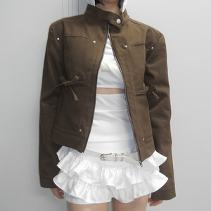 复古美式街头风女装立领夹克廓形蝴蝶结工装口袋上衣秋冬修身外套
