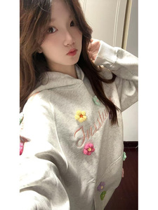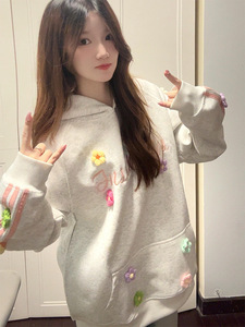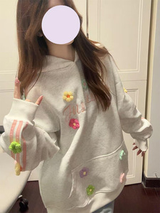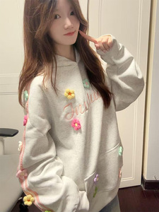 美式复古立体花朵刺绣连帽卫衣女春秋潮牌宽松休闲小个子百搭上衣