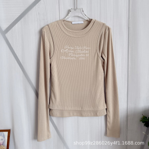 南油品质~25SS早秋新款假两件圆领徽标印花薄款修身长袖T恤女上衣