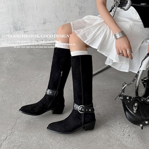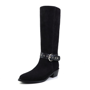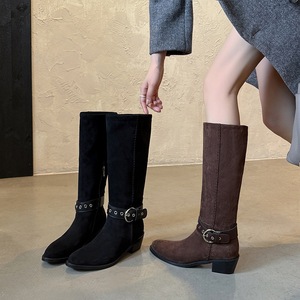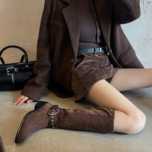 配大衣超有范~皮带扣绒面西部骑士靴2025冬粗中跟尖头高筒长靴女