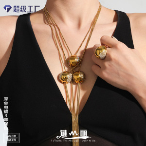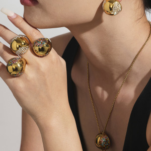 谜丽空心半圆镶锆石戒指耳钉抽拉长款毛衣项链轻奢感大气手饰套装