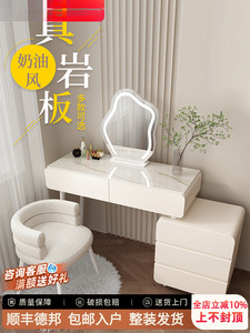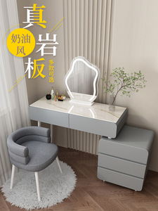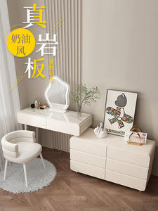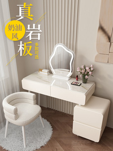 奶油风岩板实木梳妆台床头柜一体网红伸缩化妆台卧室轻奢现代简约