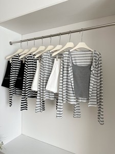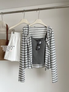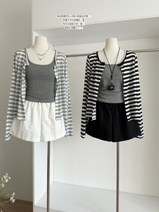 韩系休闲显瘦条纹长袖薄款防晒衣+吊带背心+高腰短裤三件套女夏季