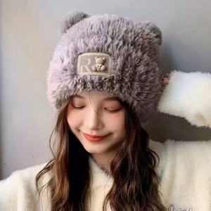 跨境批发可爱小熊耳朵针织帽子女秋冬季软糯毛绒大头围保暖毛线帽