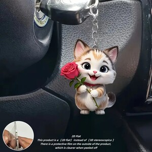 新款可爱玫瑰花小猫吊坠亚克力跨境平面车内后视镜装饰品钥匙扣挂