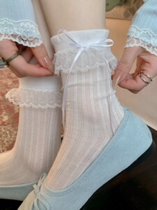 灰色蕾丝花边袜子女中筒夏季薄款芭蕾风甜美堆堆袜miu系配小皮鞋