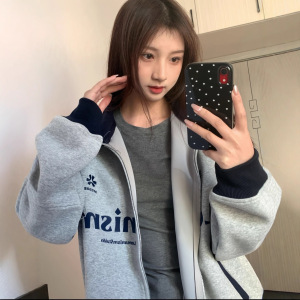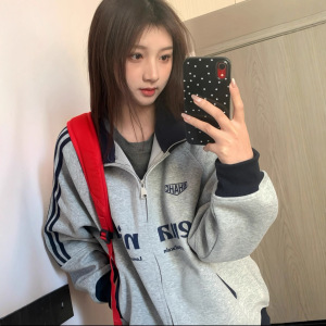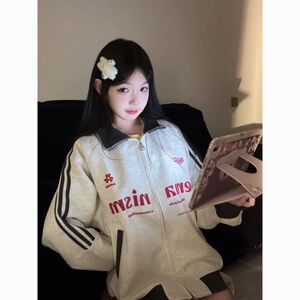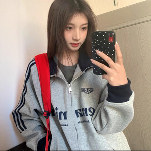 2025秋季新款通勤潮流印花字母撞色三条杠连帽卫衣外套