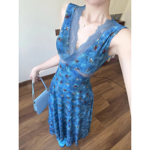 夏季流行爆款法式气质女神范轻奢高级感蕾丝拼接蓝色碎花连衣裙子