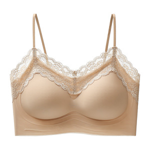 8869无痕缎面蕾丝美背吊带内衣女细肩带内搭小胸聚拢舒适背心文胸
